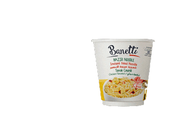Animated sticker of a Banetti instant noodle cup, chicken flavored, sliding into view, perfect for food enthusiasts.