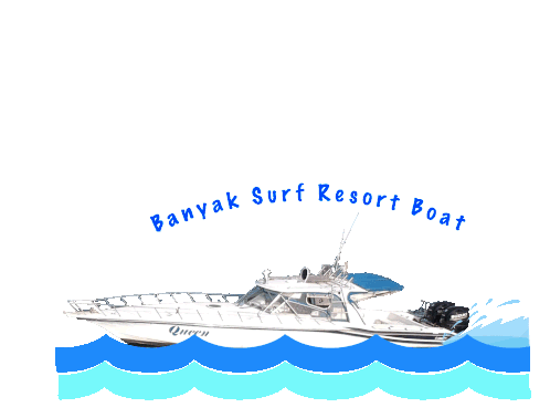 An animated sticker featuring the 'Queen' speed boat of the Banyak Surf Resort, cruising on blue ocean waves.