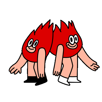 Two red, flame-like Barcamp characters with arms and legs wave their hands in a friendly, cool gesture.