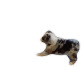 An adorable fluffy puppy with mottled fur lies down, shifting its position slightly in a relaxed manner.