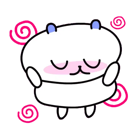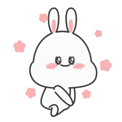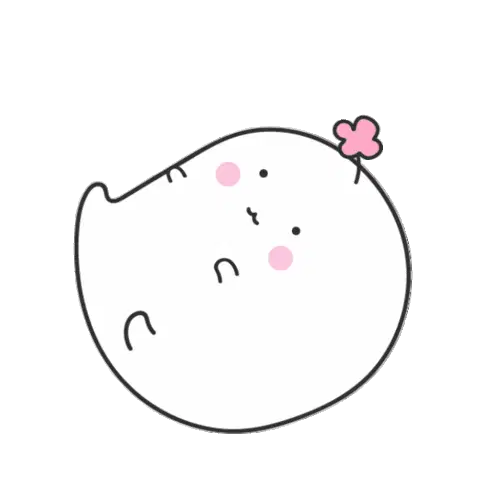A cute, shy white cat-like character blushes with rosy cheeks, showing a modest smile, conveying bashfulness.