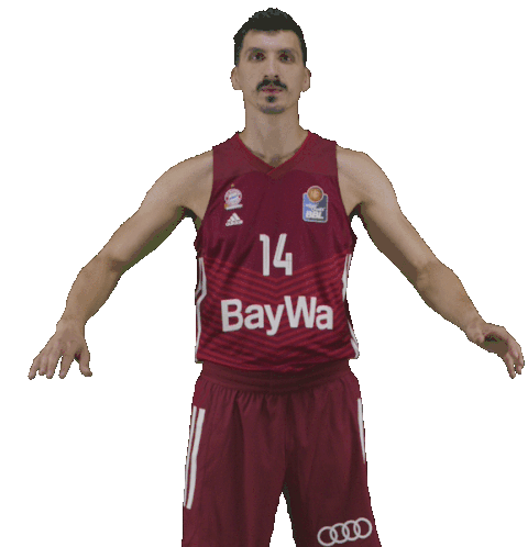 Nihad Djedovic, a basketball player for Bayern Munich, claps enthusiastically in his red jersey.