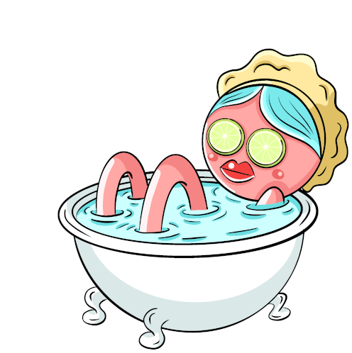 a cartoon drawing of a woman in a bathtub with cucumber slices on her eyes