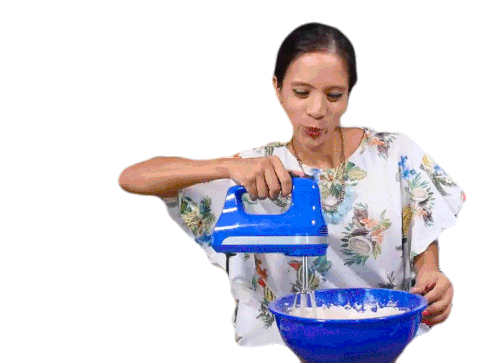 La Cooquette uses a blue electric hand mixer to vigorously beat ingredients in a bowl, preparing a delicious recipe.