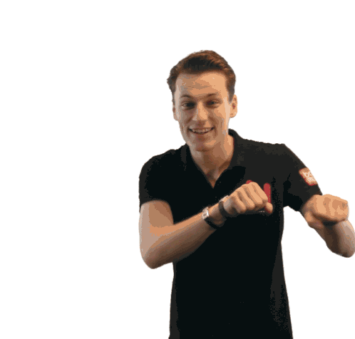 A man from Bax Shop doing a happy dance, moving his arms and smiling. Energetic and joyful dance moves.