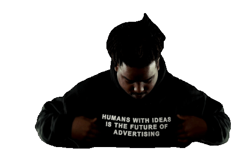 Nkosi from Bdh Collective in a black hoodie, showcasing the message 'Humans with Ideas is the Future of Advertising'.