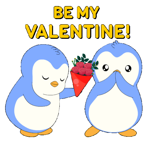 a penguin giving another penguin a bouquet of roses with the words be my valentine below it