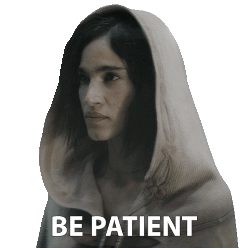 Kora, portrayed by Sofia Boutella in Rebel Moon Part One, calmly advises "Be Patient" while wearing a hooded cape.