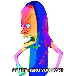 Beavis, in a vibrant, colorful style, shouts 'BE THE HERO YOU WANT'. A motivational sticker to save yourself.