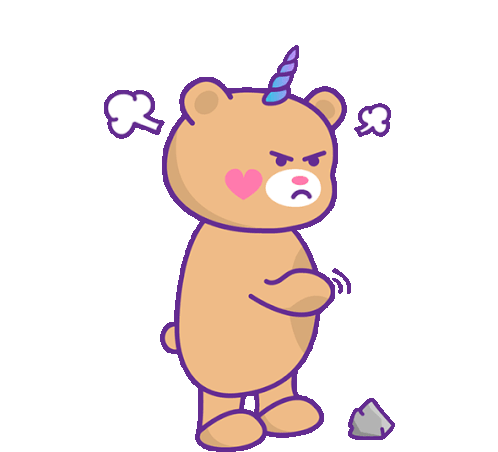 An adorable yet furious kawaii unicorn bear stomps its foot in anger, with steam rising from its head.