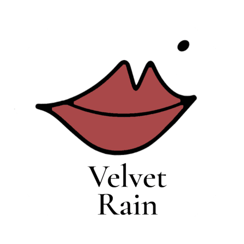 A stylish logo for Velvet Rain featuring red lips with a beauty mark and the brand name.