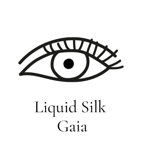 Animated drawing of an eye with 'liquid silk gaia' text, inspired by Lisa Eldridge Beauty makeup.