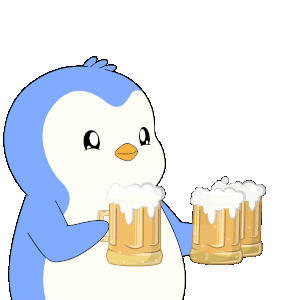 A cute animated penguin holds three mugs of foamy beer, looking around with a curious expression.