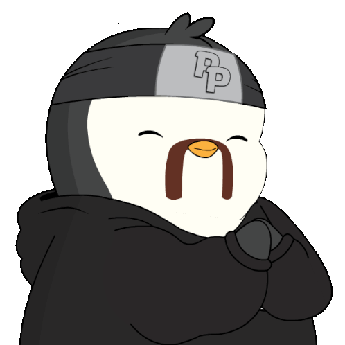 A charming cartoon penguin in a black hoodie and headband, making a pleading or begging gesture with its flippers clasped together.