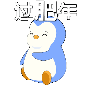 A cute, chubby penguin with a satisfied smile, featuring Chinese text '过肥年' (Have a prosperous year) for Chinese New Year.