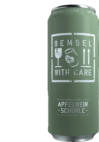 a green can of german cider that says bembele with care