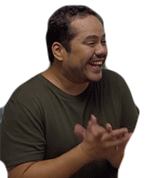 Bene Palmas enthusiastically claps his hands, smiling broadly with excitement and humor, wearing a green shirt.