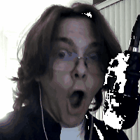Benjamin Perla makes a wide-mouthed, surprised expression, wearing headphones in this pixelated meme sticker.