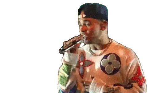 Beret, a man in a red jacket, sings and makes a 'call me' gesture, smiling and engaging with the viewer.