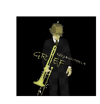 Berla Benjamin, a pixelated figure, holds a trombone with 'GRIEF' displayed, rotating against a black background.