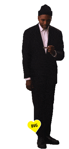 A man in a black suit and white shirt, often associated with Berlin's nightlife bouncers, stands with a BVG heart sticker.
