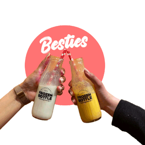 Animated sticker showing two hands clinking 'Frozen Bottle' drinks, with 'Besties' text in a red circle, celebrating friendship.