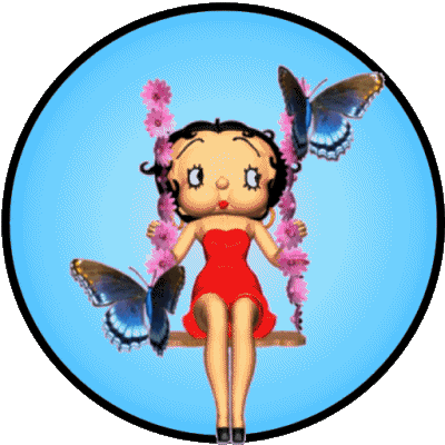 Betty Boop gently sways on a flower-decorated swing, surrounded by two beautiful blue butterflies in a serene blue circle.