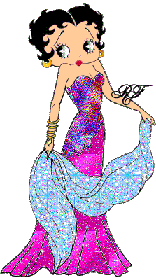 Betty Boop sparkles in a glittery pink and purple dress, elegantly holding a shimmering pale blue shawl.