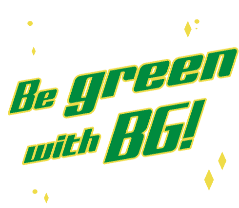 Animated sticker featuring the phrase "Be green with BG!" in vibrant green and yellow text, accompanied by sparkling diamond shapes.