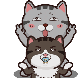 Bggso Hungvh features a grumpy brown cat with a pacifier in front of a surprised grey cat with raised hands.