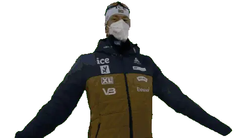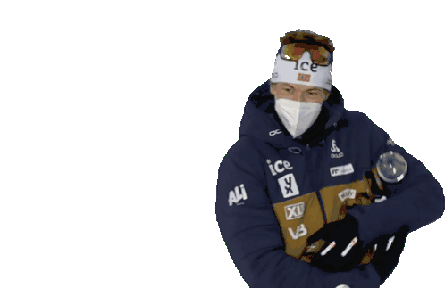 Biathlete Sturla Lægreid celebrates his medal win, smiling and showing off his achievement in winter gear and a face mask.