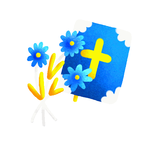 An animated sticker featuring a blue Bible with a yellow cross, accompanied by a bouquet of blue and yellow flowers, symbolizing faith and hope for Ukraine.