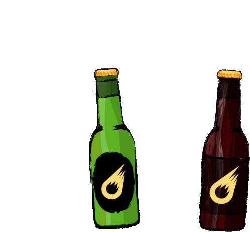 Two beer bottles, one green and one brown, clink together in a celebratory toast, featuring the Bieremeteor logo.