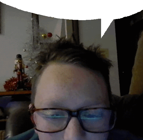 a man wearing glasses is looking at the camera with a nutcracker in the background