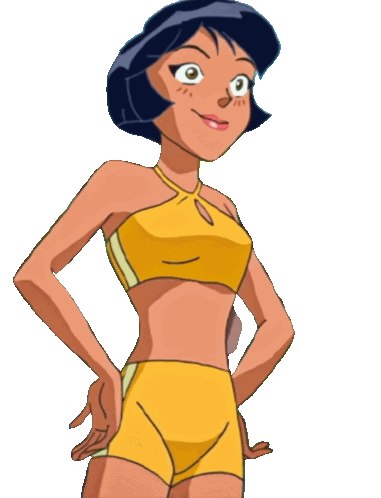 a cartoon girl is wearing a yellow bikini top and shorts