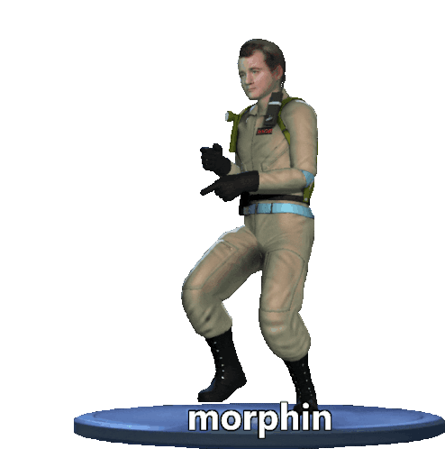 Bill Murray as Peter Venkman from Ghostbusters performs a morphing dance, reminiscent of disco moves.