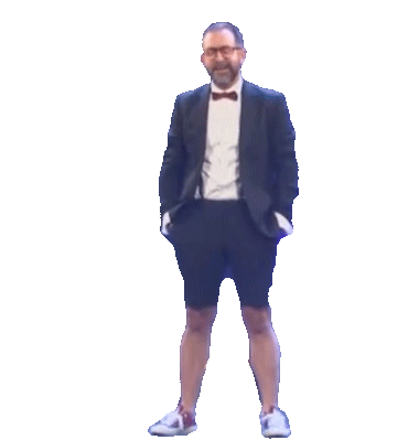 a man in a tuxedo and shorts is dancing with the words et bim written above him