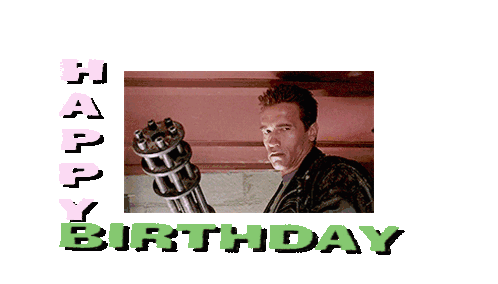 Arnold Schwarzenegger and Edward Furlong from Terminator 2 wish a Happy Birthday, featuring Arnold with a minigun and Edward smiling.