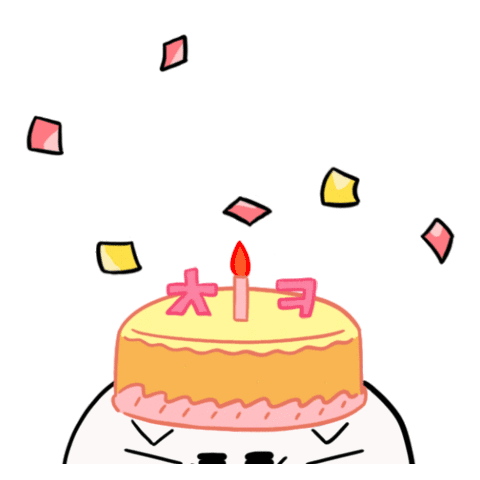 An adorable animated character celebrates a birthday with a cake on its head and confetti falling, expressing pure joy.