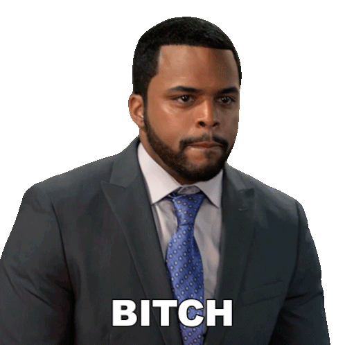 Hayden, a character from BET's Sistas, reacts with the word 'BITCH' displayed, capturing a strong emotional moment.