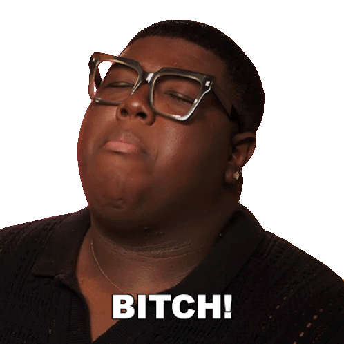 a man wearing glasses and a black shirt says " bitch " on a white background