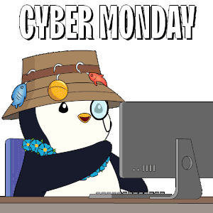 A cute penguin in a hat and monocle shops online for Cyber Monday deals, surrounded by other small penguins.