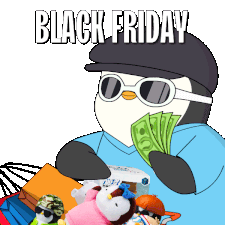 A cool Pudgy Penguin celebrates Black Friday, holding cash amidst a pile of new toys and shopping bags after a successful spree.