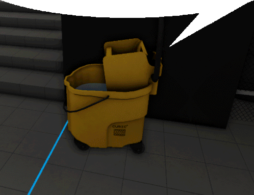 a yellow cubic mop bucket sits on a tiled floor next to stairs