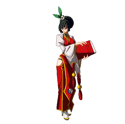 Litchi Faye Ling from Blazblue in various poses, showcasing her iconic red outfits and flowing cape, by Arcsys.
