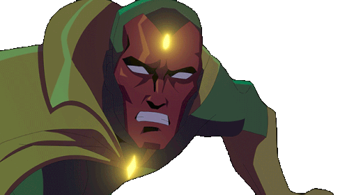a cartoon drawing of a man with a red eye and a green cape