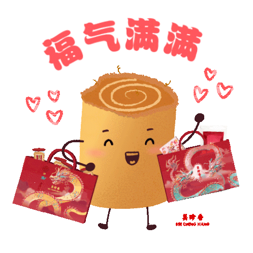 A cute animated cake roll character holding red dragon shopping bags, with "Full of blessings" text and hearts for Chinese New Year.