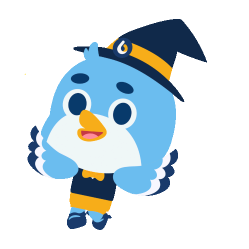 a cartoon bird wearing a witch hat with a letter b on it