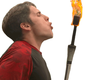 A man with puffed cheeks dramatically blows a stream of fire from his mouth using a torch in this sticker.
