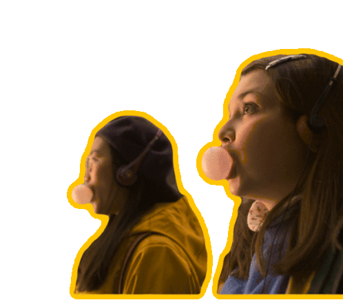 Beverly Moody (Gemma Brooke Allen) and Ellen (Audrey Hsieh) blow large pink bubblegum bubbles, looking focused and playful.